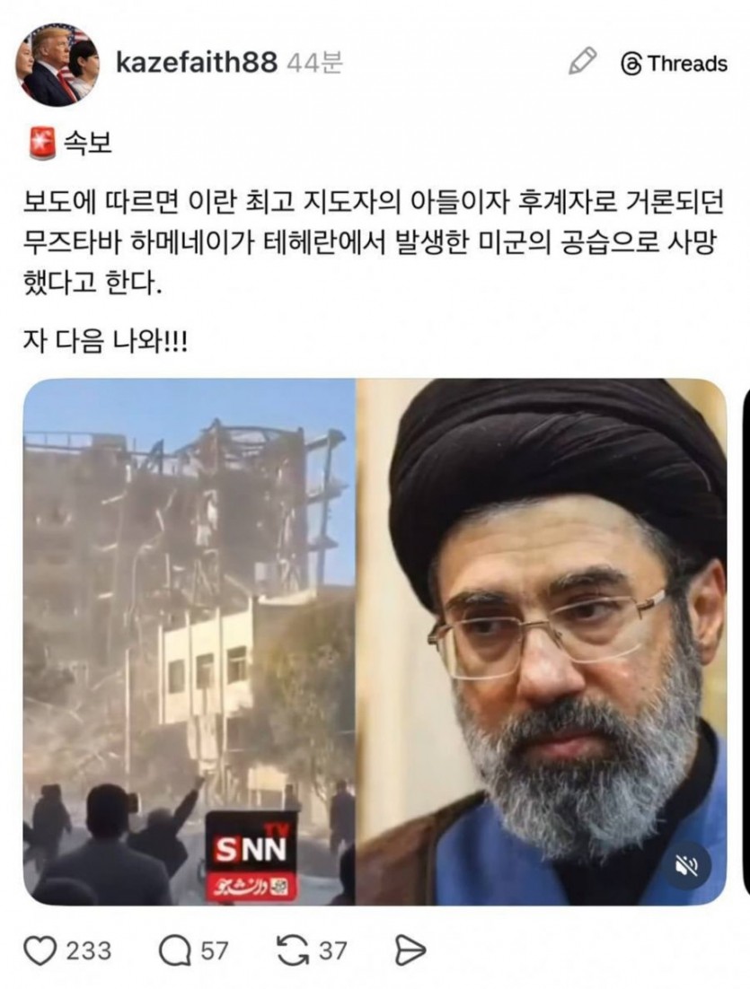 (속보) 하메네이 아들 사망 작성자 정보 81b20880 작성 작성일 2026.03.04 21:14 컨텐츠 정보 355 조회 0 추천 0 비추천 목록 본문 사망.. 0 추천 0 비추천 SNS 공유 관련자료 이전 BTS 공연 앞두고 갤럭시 대여 증가 작성일 2026.03.20 21:58 다음 속보) 이란 미친 사우디 아람코 시설 공격 ㄷㄷㄷ 작성일 2026.03.02 17:37 댓글 0 등록된 댓글이 없습니다. 로그인한 회원만 댓글 등록이 가능합니다. 목록